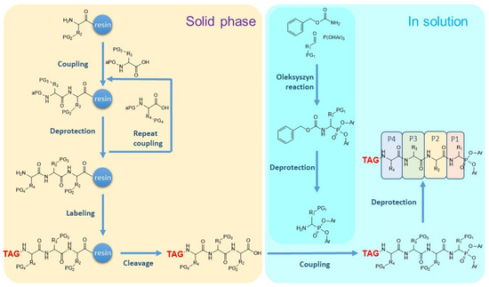 Peptidyl ABPs are produced in three basic steps: [1] synthesis of the tag-P4-P3-P2 tripeptide sequence by established solid phase peptide synthesis procedures, [2] synthesis of the phosphono-P1 derivative with the Oleksyszyn reaction, and [3] in solution coupling of the tripeptide with the phosphono-analogue of the P1 residue, deprotection, and purification. The synthesis scheme is outlined in Figure 7. The compounds are produced as diastereoisomers. The R isomer at the α-carbon is the active compound but they are almost exclusively used in racemic mixtures of the R and S isomers. Nevertheless, in the case of a new phosphonate ABP that targets matriptase different diastereomers on α-carbon were separated and tested. As expected, the compound exhibiting R stereochemistry over the α-carbon combined with S stereochemistry over the amino acid residue at the P2 position (N-terminal position) showed the best inhibitory properties, i.e., higher kinact/Ki [48].