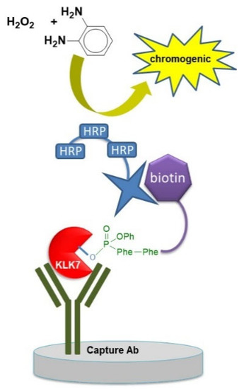 This assay was named ABP ratiometric (ABRA) ELISA and uses an immobilized antibody to capture the active protease-ABP adduct. The affinity tag of the ABP is used for quantification [49]. The assay was used to quantify the active KLK6 in biological and clinical specimens in order to determine the ratio of active versus total KLK6 protease. The Bio-PK probe that selectively labels trypsin-like enzymes [9] reacted with the KLK6 in the biological sample. Selectivity for KLK6 is ensured by the KLK6-capturing antibody. A schematic diagram of the ABRA-ELISA is depicted in Figure 8. Further, the ABRA ELISA was applied to determine the levels of active KLK7 using a KLK7 capturing antibody and the biotin-Phe-Phe-P(O)(OPh)2 KLK7-ABP [16].