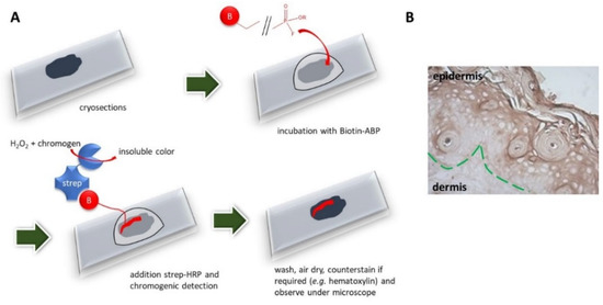 It refers to a histochemical assay developed by Pampalakis et al. [50] that can be applied to detect and spatially localize specific enzymatic activities in tissue biopsies by use of ABPs [50,51]. A schematic description of activography is provided in Figure 9. Briefly, tissue cryosections are allowed to react with a biotin-labelled ABP. Subsequently, streptavidin-horseradish peroxidase (HRP) is added and the tissue distribution of the active protease is visualized by a HRP-catalyzed chromogenic reaction. A variation of this method that used qABPs had been published previously. In that case, the qABP was allowed to react with the cryosections and the protease-ABP adduct was detected with fluorescence microscopy [52].