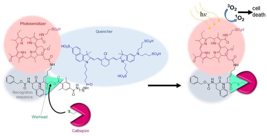 Cathepsins have been implicated in malignant tumor growth and metastasis, since they promote tumor angiogenesis and cancer cell invasion by cleavage of the extracellular matrix. In this context, cathepsins are valuable targets for both diagnostic and therapeutic applications [54]. Especially, cathepsins B, L, and S display increased expression in cancer, and may contribute to tumor invasiveness by cleavage of E-cadherin. For this reason, a qABP named YBN14 was developed that emits fluorescence when covalently bound to cathepsins and, at the same time, it can kill cancer cells by photodynamic therapy (PDT) [55]. YBN14 contains a photosensitizer that is a bacteriochlorin derivative, a selective cathepsin recognition sequence, an acyloxymethyl ketone warhead and a QC-1 quencher (Figure 10). The quencher is attached to the leaving group and is released during covalent labeling of the active cathepsin, thus, cathepsin activity is monitored by fluorescence emission. In PDT, a photosensitive molecule is irradiated (e.g., by infrared frequencies) under oxygen to generate reactive oxygen species, including singlet oxygen, that are cytotoxic.