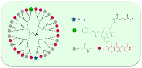 X-ray computed tomography (CT) is an imaging method with excellent spatial resolution. A new iodinated nanoscale ABP that binds to cathepsins B, L, and S was developed as contrast agent based on iodine that is primarily used in CT. It carries a short cathepsin-targeting peptide sequence, an acyloxymethyl ketone warhead, and a dendrimer tag that can accommodate up to 48 iodine atoms [66], as shown in Figure 11. This ABP provided detectable CT contrast when it was administered in mice bearing subcutaneous 4T1 breast tumors.