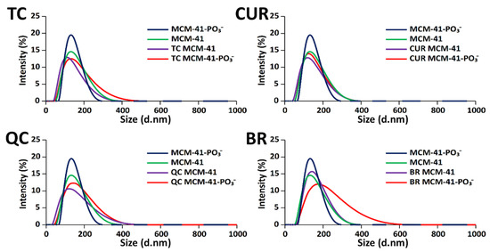 The loading of SrtAIs into the MSNs affected the Z-Ave size and PDI. For MCM-41, a slightly lower Z-Ave size was observed for TC (107.8 ± 1.70 nm), CUR (105.9 ± 2.00 nm), and QC (105.9 ± 2.00 nm)-loaded MSNs, while a higher Z-Ave was observed for BR (141.8 ± 1.80 nm)-loaded MSNs (Table 1 and Figure 1). In comparison, similar Z-Ave sizing (125.4–127.4 nm) to the unloaded MSNs was observed for TC, CUR, and QC-loaded MCM-41-PO3−, with the BR-loaded MCM-41-PO3− again demonstrating a larger Z-Ave size (162.5 ± 1.80 nm) (Table 1 and Figure 1). The polydispersity index (PDI) was also observed to increase with SrtAI-loading, with the MCM-41-PO3− MSNs continuing to demonstrate lower PDI values (0.16–0.22) compared to MCM-41 (0.19–0.29) after SrtAI loading (Table 1). Despite this, the observed PDI values for the SrtAI-loaded MSNs were similar (0.16–0.22), except for CUR-loaded MCM-41 (0.29 ± 0.01), which exhibited a higher variation in particle size. However, all formulations remained dispersed without large aggregates (PDI < 0.3) [29]. Finally, SrtAI-loading was observed to reduce the negative Zeta-potential associated with each MSN, with TC and BR having the greatest effect. For BR, this was hypothesized to be due in part to ionic interactions between its positively charged quaternary ammonium group and the negatively charged MSN silanol and phosphonate groups.