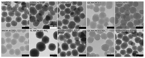 TGA was used to determine the SrtAI loading capacity of MCM-41 and MCM-41-PO3− MSNs by comparing the weight loss associated with temperature ramping (50–900 °C; 25–900 °C for TC-loaded MSNs) between unloaded MSNs, SrtAI-loaded MSNs, and the SrtAIs alone. Using this technique (Figure 3), the loading capacities of TC, CUR, QC, and BR in MCM-41 MSNs were 9.8, 7.6, 9.6, and 8.7% (w/w), respectively, and 9.2, 9.3, 8.5, and 6.2% (w/w) in MCM-41-PO3− MSNs, respectively. The theoretical MSN loading capacity for each SrtAI was 10% (w/w), based on the rotary evaporation formulation method, where 10 mg of each individual SrtAI was added to 90 mg of each MSN. Thus, these data suggest that the MSNs were efficiently loaded with SrtAIs. In addition, similar SrtAI loading capacities were measured between the MCM-41 and MCM-41-PO3− MSNs, except for BR, which demonstrated a 29% lower loading capacity with MCM-41-PO3− compared to MCM-41. In agreement with this study, other studies [19,30] have demonstrated the capacity of the rotary evaporation loading method to effectively encapsulate both hydrophilic and hydrophobic drugs within the extensive porous network of MSNs.
