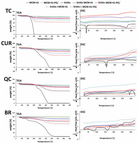 Thermogravimetric analysis (TGA) and differential scanning calorimetry (DSC) for SrtAIs (TC, CUR, QC, and BR), and MSNs (MCM-41 and MCM-41-PO3−) alone, loaded with SrtAIs, or physical mixtures with SrtAIs. “+” refers to physical mixture and ‘arb. unit’ indicates arbitrary units.