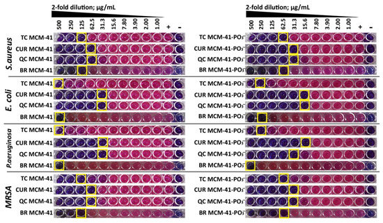 Determination of MIC values for each SrtAI (TC, CUR, QC, BR)-loaded MCM-41 and MCM-41-PO3− MSN against S. aureus (MSSA) ATCC25923, MRSA ATCC43300, E. coli ATCC25922, and P. aeruginousa ATCC27853 using a BMD assay with resazurin colorimetric readout. Yellow boxes indicate the MIC value for each formulation.