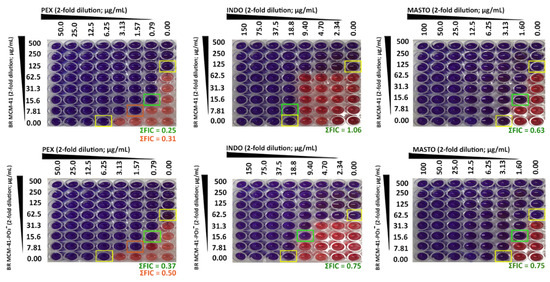 The MICs of PEX, INDO, and MASTO against S. aureus ATCC25923, MRSA ATCC43300, E. coli ATCC25922, and P. aeruginosa ATCC27853 were determined according to the CLSI BMD method with resazurin readout [20], as described above. In this method, 100, 200, and 300 µg of PEX, INDO, MASTO, respectively, were dissolved in 0.01% (v/v) DMSO-MHB (to 1 mL) and used to load column one of individual 96-well microplates. After 2-fold serial dilution and the addition of the standardized inoculum (100 µL; 1 × 106 CFU/mL), PEX, INDO, and MASTO yielded 50.0–0.10 µg/mL, 150–0.29 µg/mL, and 100–0.19 µg/mL concentration ranges, respectively. Experiments were performed in triplicate.