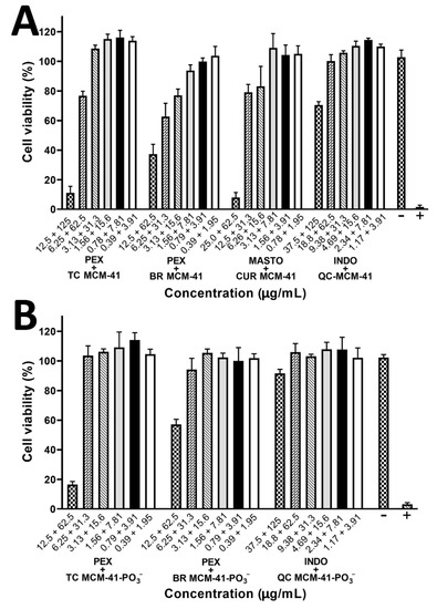 Assessment of the effects of SrtAI-loaded (TC, CUR, QC, and BR) (A) MCM-41 and (B) MCM-41-PO3− MSNs on HEK-293 cell viability after 24 h incubation using a resazurin cell viability assay. Data are expressed as mean ± SD (n = 3) (p > 0.05). Results are demonstrated as a reduction percentage of viable cells and compared with non-treated cells.