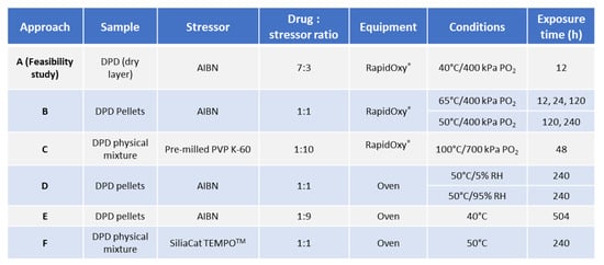 Approach D: To assess the feasibility of degradation without the elevated oxygen pressure conditions, replicate pellets containing a ratio of AIBN:DPD 1:1 were placed in an oven (under atmospheric oxygen pressure) at 50 °C/5% RH for 240 h, respectively. Moreover, the impact of higher humidity (i.e., at 50 °C/95% RH for 240 h) on oxidation was also studied by placing replicate pellets in a desiccator filled with ultra−pure water, which was then loaded into an oven. Individual pellets composed of DPD and AIBN alone were also placed in parallel as controls.