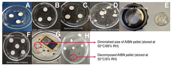Images showing autoxidation approaches with DPD:AIBN (1:1) pellets exposed to different conditions. (A) Feasibility approach with AIBN layer topped with DPD in DSC pans before exposure in RapidOxy®; (B) original appearance of DPD:AIBN pellet before exposure in RapidOxy®; (C) appearance of pellets after exposure in RapidOxy® (65 °C/12 h/400 kPa); (D) disintegrated pellets after exposure in RapidOxy® (65 °C/24 h/400 kPa); (E) AIBN layer deposited on the lid (left) and disintegrated pellets (right) after exposure in RapidOxy® (65 °C/120 h/400 kPa); (F) original appearance of pellets before exposure in the oven; (G) appearance of pellets after exposure in the oven (50 °C/95% RH/240 h); (H) Appearance of pellets after exposure in the oven (50 °C/5% RH/240 h).