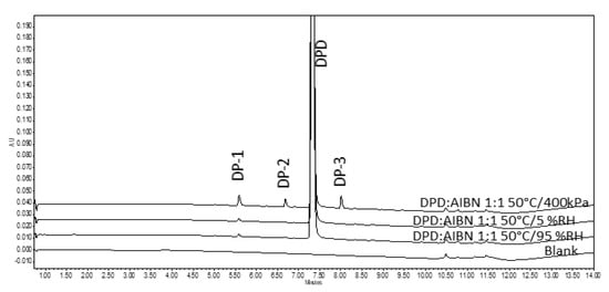 Chromatogram showing the formation of DPs in DPD:AIBN compacts when exposed to different oxidative conditions and an enrichment of DPs when exposed under high oxygen pressures (400 kPa) in RapidOxy®.