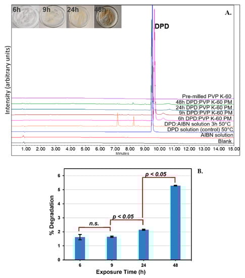 A kinetic study was carried out by using a physical mixture of DPD and pre−milled PVP K−60 (1:10) at different time points such as 6, 9, 24, and 48 h using the same conditions (100 °C/700 kPa) in RapidOxy® (replicates N = 2). Statistical analysis, including the t−test, was performed on the degradation values using Excel software (Microsoft Office, version 2108, Washington, DC, USA). The first array was kept as the exposure time in RapidOxy® and the second array was the extent of degradation, and a two−tailed distribution of type two−sample equal variance was used to determine the p−values.