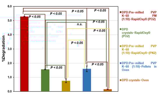 Similarly, the exposure of pellets containing the PM as mentioned above under atmospheric pressure (in an oven) resulted in a degradation of 1.60 ± 0.21% (98.40% AUC), indicating that degradation can proceed in the presence of stressor (pre−milled PVP K−60) albeit to a lower extent as compared to pressurized oxidation setup. Negligible degradation of 0.16 ± 0.01% was observed when the DPD crystals (alone) were exposed in an oven at 100 °C under atmospheric pressure. Statistical analysis of degradation values indicated that the difference was statistically significant in all the control samples (p−values were below 0.05). An exception to this was between the DPD crystals exposed in RapidOxy® under accelerated pressure and the DPD:pre−milled PVP K−60 (1:10) pellets exposed in the oven (Figure 7).