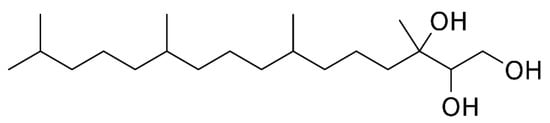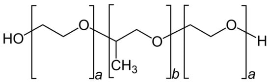 Phytantriol (Figure 2) is an amphiphilic lipid commonly used in the production of self-assembled lyotropic LCNs due to its biocompatibility and propensity to form non-lamellar phases in aqueous environments, including inverse bi-continuous cubic and inverse hexagonal phases [,]. Recently, the use of phytantriol has been popularized due to its lack of ester and unsaturated bonds, which provides greater chemical stability against hydrolysis and enzymatic degradation [,]. A phytantriol-based cubic phase precursor solution was incorporated with the anti-cancer drug hydroxycamptothecine (HCPT), where the results showed that a phytantriol-based cubic phase embolic gelling solution can be a promising carrier for HCPT delivery and sustained drug release by vascular embolization. Incorporating berberine into phytantriol-based LCNs could potentially rectify the solubility and stability issues of berberine. In addition, poloxamer 407 (Figure 3) is a hydrophilic non-ionic surfactant that is employed in the formulation of nanostructures.