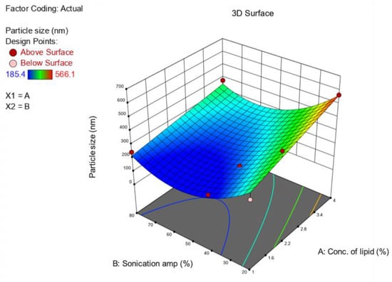 The relationship between the factors and response variables were elucidated using the 3D response surface plots. Increases in lipid concentrations increased the PS values, whereas at high lipid concentrations (>2.8%), increases in sonication amplitudes up to 60% decreased PS to approximately 200 nm, after which PS was increased up to 300 nm (Figure 4).