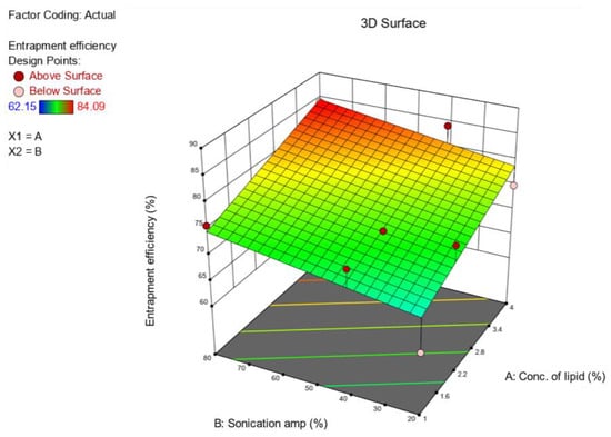 Increases in lipid concentration increased EE, while at low lipid concentrations (<2.2%) changes in sonication amplitude showed no prominent effects on EE (Figure 5). However, at higher lipid concentrations (>2.2%), increases in sonication amplitude increased EE (Figure 5).