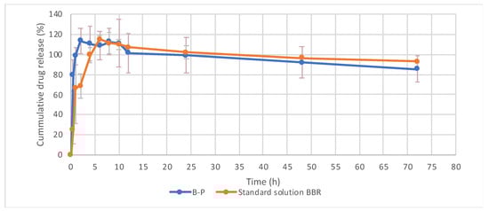 Cumulative release profile of berberine from LCNs. Each value represents mean ± SD (n = 3). B-P refers to berberine–phytantriol nanoformulation; BBR refers to standard berberine.