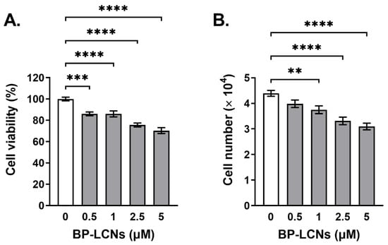 A549 cells were seeded at a density of 20,000/well in a 48-well plate (Corning). After 80% confluency, the cells were incubated at 37 °C for 24 h in the absence or presence of BP-LCNs (final concentration of 0.5, 1, 2.5, or 5 µM). The cells were washed 1× with PBS, harvested with trypsin, and centrifuged at 300× g for 4 min. The supernatant was removed, and the cell pellets were resuspended with PBS. Next, 10 µL of cell suspension was mixed with trypan blue solution (0.4% (w/v), Thermo Fisher Scientific, Waltham, MA, USA) at a ratio of 1:1 and the number of viable cells was counted under a phase-contrast microscope using a hemacytometer (Hawksley and Sons Ltd., Lancing, UK) as previously described [].