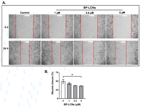 The results from wound healing assay showed that BP-LCNs inhibit the migratory activity of A549 cells in a dose-dependent manner (Figure 9). After 24 h of scratching the wound, the cells that were incubated in the absence of BP-LCNs (control) showed 49.4 ± 5.5% wound closure. The inclusion of BP-LCNs at final concentrations of 1 and 2.5 µM showed decreases in wound closure of 43.2 ± 3.1 and 37.6 ± 0.6%, respectively, relative to the control (Figure 9). However, these differences were not statistically significant. When the final concentration of BP-LCNs in the incubation was increased to 5 µg/mL, the wound closure decreased by 26.3% relative to the control (Figure 9, 49.4 ± 5.5% for control vs. 36.4 ± 0.4% for cells incubated with 5 µM BP-LCNs, p < 0.05).