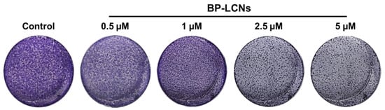 A549 cells were seeded at a density of 500/well in 6-well plates. The cells were treated with or without BP-LCNs (final concentration of 0.5, 1, 2.5, or 5 µM) and incubated at 37 °C for 2 weeks. The culture medium with or without BP-LCNs was replaced every 48 h. The cells were washed once with PBS and fixed at room temperature for 20 min with 3.7% (v/v) formaldehyde. The cells were washed 3× with PBS, then stained with 0.4% crystal violet (Merck). The cells were again washed 3× with PBS. Images of wells were taken from the bottom side of the plates, as previously described [].