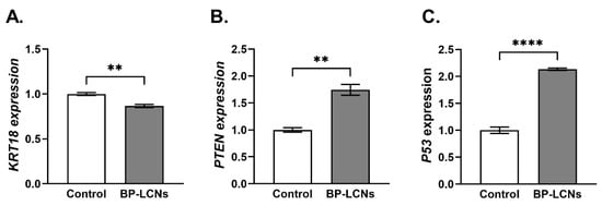 The incubation of A549 cells with 5 µM concentration of BP-LCNs decreased the mRNA levels of KRT18 by 13.3% (Figure 11A, p < 0.01) compared to the cells that were incubated without BP-LCNs (control). On the other hand, the mRNA levels of PTEN and P53 were increased by 113.3% (Figure 11B, p < 0.0001) and 74.7% (Figure 11C, p < 0.01), respectively, in the cells that were incubated with 5 µM BP-LCNs relative to control.