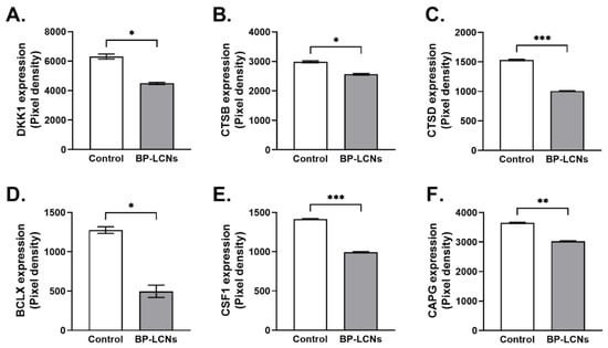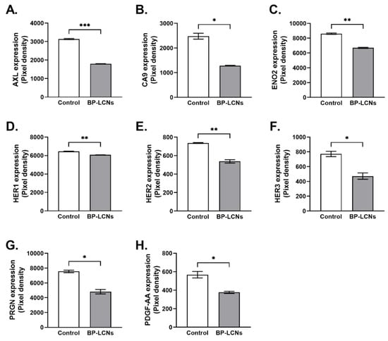 The results from a protein profiler array indicated that the presence of BP-LCNs in the incubation significantly downregulated the expression levels of several proteins associated with proliferation in A549 cells. These included AXL, CA9, ENO2, HER1, HER2, HER3, PRGN, and PDGF-AA (Figure 12A–H). The inclusion of BP-LCNs in the incubation decreased the expression of AXL by 42.8% (3137 ± 33.1 for control vs. 1795 ± 12.5 for BP-LCNs-treated cells, p < 0.001, Figure 12A), CA9 by 48.3% (2479 ± 120.2 for control vs. 1281 ± 20.5 for BP-LCNs-treated cells, p < 0.05, Figure 12B), ENO2 by 22.2% (8607 ± 88.2 for control vs. 6700 ± 69.3 for BP-LCNs-treated cells, p < 0.01, Figure 12C), HER1 by 5.9% (6455 ± 20.5 for control vs. 6077 ± 5.6 for BP-LCNs-treated cells, p < 0.01, Figure 12D), HER2 by 26.9% (736 ± 4.9 for control vs. 538 ± 18.4 for BP-LCNs-treated cells, p < 0.01, Figure 12E), HER3 by 38.8% (771 ± 36.1 for control vs. 472 ± 43.0 for BP-LCNs-treated cells, p < 0.05, Figure 12F), PRGN by 36.2% (7552 ± 176 for control vs. 4819 ± 306 for BP-LCNs-treated cells, p < 0.05, Figure 12G), and PDGF-AA by 33.6% (568 ± 35.1 for control vs. 377 ± 12.2 for BP-LCN-treated cells, p < 0.05, Figure 12H).