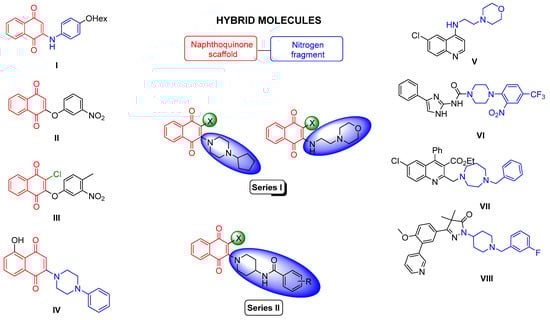 Compounds derived from natural or synthetic naphthoquinones have been considered as privileged scaffolds for obtaining novel agents with antiparasitic activity [,,]. Our research group previously reported the synthesis and trypanocidal evaluation of a series of 2-anilino-1,4-naphthoquinones, highlighting compound I (Figure 1), which exhibited potent activity against epimastigotes of the Tulahuén strain (IC50 = 1.72 µM) and high selectivity against Vero cells []. Subsequently, we reported the synthesis and evaluation of a series of aryloxy-quinones against the Y strain of T. cruzi epimastigote, where 2-(3-nitrophenoxy)-1,4-naphthoquinone II (Figure 1) displayed remarkable nanomolar inhibitory activity (IC50 = 20 nM) and a high selectivity index (SI = 625) compared with J774 murine macrophages cells []. To evaluate our quinone derivatives on other T. cruzi strains as well as trypomastigote forms, we recently designed and synthetised a small series of aryloxy-naphthoquinones. Our best results were for compound III, which showed high potency on the NINOA strain of T. cruzi trypomastigotes (IC50 = 9.38 µM), low toxicity on J774 cells (IC50 = 117 µM), and was more potent and selective than Bzn (40.67 and 352 µM, respectively) [].