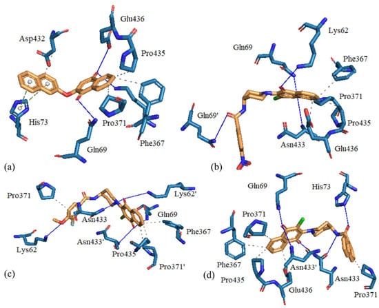 Binding modes on the Z-site of (a) NQ-q, (b) 7b, (c) 7h, and (d) 7j.