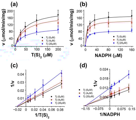 Kinetic behaviour of TcTR in the presence of 7j. Panel (a), the concentration of TS2 was varied at different concentrations of 7j (0–20 µM) at NADPH fixed (160 µM). Panel (b), the concentration of NADPH was varied at different concentrations of 7j (0–20 µM) at TS2 fixed (200 µM). Plots in panels (a,b) were obtained by a non-linear global fit to Equation (1) using Origin 8 software. Panels (c,d) show the Lineweaver−Burk plots of the kinetic data fitted to the linear form of Equation (1) using Origin 8 software. Data are the average of three independent enzyme preparations (±SD).