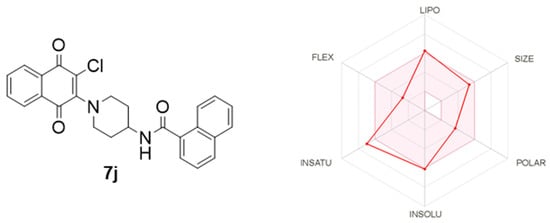 The bioavailability radar plot of 7j. The pink zone represents the range of the values for optimal oral bioavailability property, and the predicted properties were displayed as red lines. The radar was generated by SwissADME (http://www.swissadme.ch/index.php, accessed on 27 January 2022).