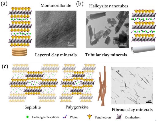 Structure and microphotographs of (a) layered clay minerals, (b) tubular clay minerals, and (c) fibrous clay minerals. Adapted with permission from [13]. CC BY 4.0.
