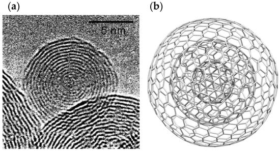 Carbon nano-onions (CNOs) are a versatile class of carbon-based nanostructures composed of multiple concentric shells of fullerenes, that recently aroused great interest in the scientific community. They are characterized by a cage-within-cage structure, with smaller fullerenes inside larger ones (Figure 5) [26,38]. They consist of quasi-spherical nested graphitic layers close to one another with dimensions that can range from 2 to 50 nm, depending on the synthesis method. The distance between the shells is 3.4 Å, which is slightly different to the distance between two graphitic planes, that is 3.334 Å [39]. The pentagonal and hexagonal rings that compose the structure consist of two single bonds and one double bond between the carbon atoms. Moreover, they can contain either C60, a hollow core, or a metallic core as the innermost shell [26,39,40].