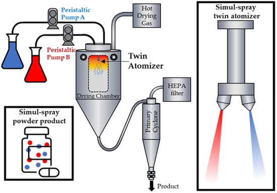 Simul-spray drying setup schematic. For simplicity, the atomization gas supply lines are not depicted.