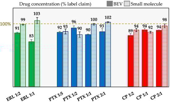 For the case studies demonstrated in this work, two of the small molecule APIs are insoluble in water (ERL and PTX) and thus cannot be mixed with the BEV solution. BEV is unstable in organic solutions. Cisplatin has slight solubility in water, but it is not chemically stable in an aqueous solution for longer than a few hours as it is susceptible to ligand exchange [,]. Thus, simul-spray was particularly enabling for the model compounds demonstrated here.