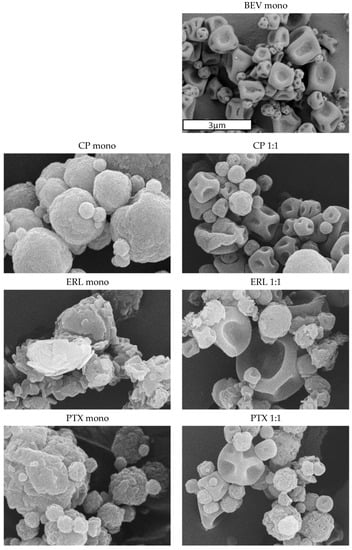 BEV spray-dried formulations and small molecule spray-dried formulations have different surface features and morphology, making it possible to visually distinguish between the particles in SEM images. Exemplary SEM images of this is shown in Figure 3, which depicts BEV, CP, ERL, and PTX mono-API formulations along with their corresponding 1:1 simul-spray formulations. The BEV particles have a smooth surface and are fairly collapsed, while the ERL, PTX, and CP particles have a corrugated surface and are generally closer to spherical in shape. The difference is most prominent for the ERL simul-sprays due to the presence of ERL as crystals.