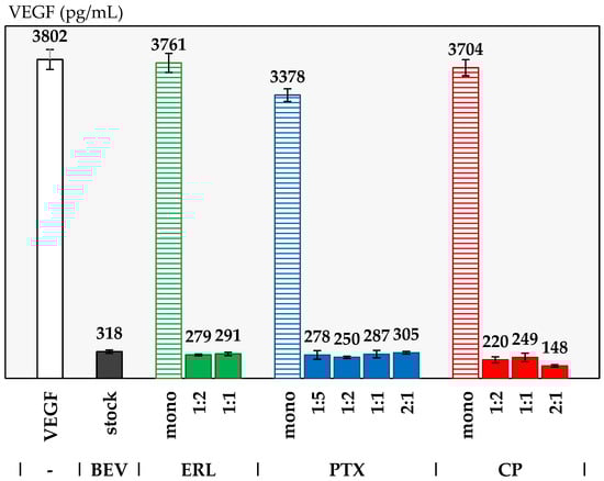 Figure 4 shows the results of the VEGF assay. The positive control sample, using BEV stock, has 318 pg/mL of unbound VEGF. The negative control samples all read VEGF values of >3000 pg/mL, saturating the detection of the assay, as expected. The ERL, PTX, and CP negative controls all show that the small molecules do not inhibit VEGF measurably. Both the ERL 1:2 and 1:1 simul-sprays have similar values, which are the same as those for the positive control within the error of the assay. All PTX formulations show VEGF-inhibition levels similar to the positive control. All three cisplatin simul-sprays show VEGF inhibition. It is not known at this time why the CP 2:1 formulation appears to inhibit more strongly than the others, and detailed assay development is out of the scope of this work.