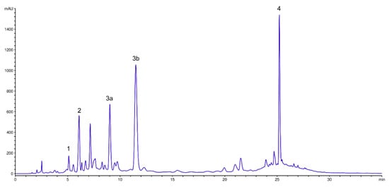 HPLC of PoPEx. 1. Gallic acic; 2. Punicalin; 3a. Punicalagin-α; 3b. Punicalagin-β; 4. Ellagic acid.