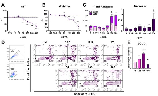 To study the mode of cytotoxicity, an Annexin V-Fluorescein Isothiocyanate/Propidium Iodide (Annexin-V-FITC/PI) staining was used. The results presented in Figure 2C,D show that the cytotoxicity in cultures with the two highest concentrations (100 µg/mL and 200 µg/mL) of PoPEx was due to apoptosis. With increasing concentration, the percentage of late apoptotic cells dominated over early phase apoptosis. Minimal necrosis was seen with the highest concentration of PoPEx. The increased apoptosis corresponded to the downregulation of the antiapoptotic BCL-2 molecule at the level of mRNA expression after a 4-h culture with a proapoptotic concentration of PoPEx (100 µg/mL). It is interesting that BCL-2 expression was upregulated in the presence of lower concentrations of PoPEx (50 µg/mL and 12.5 µg/mL) (Figure 2E).