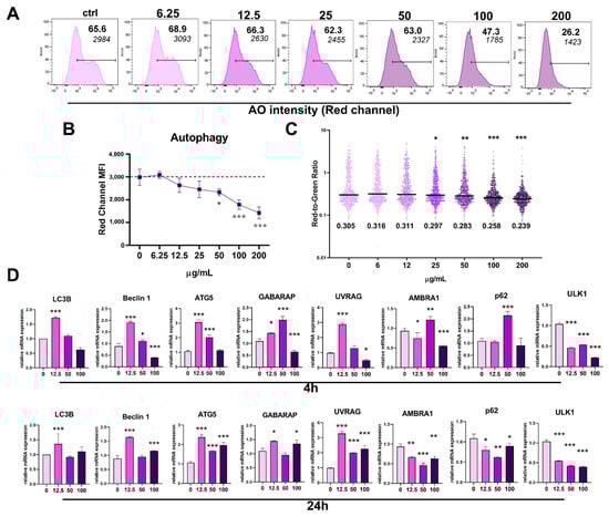 The effects of PoPEx on autophagy in PBMC. Autophagy in PBMC was determined after the cultures of PBMC (3 × 105/well) were treated with increasing doses of PoPEx (6.25–200 µg/mL) for 24h, by acridine orange (AO) staining and flow cytometry analysis. (A) A representative analysis of red fluorescence AO intensity is shown, along with the summarized data (B). (C) The red to green fluorescence ratio was determined by dividing FL2 channel MFI with FL1 channel MFI in AO-stained samples (wo compensation) for each gated event in FCS files. (D) Relative mRNA expression for indicated autophagy-regulatory genes in PBMC treated with 12.5 µg/mL, 50 µg/mL, or 100 µg/mL for 4 h or 24 h, was determined by qPCR using the 2−∆∆Ct method, and β-actin as a reference gene in the treated groups. The summarized data (B) are shown as mean ± SD from four independent experiments, whereas data in (D) is shown as mean ± SD from three independent experiments. * p < 0.05, ** p < 0.01, *** p < 0.005, compared to control non-treated PBMC (Friedman test; Dunn’s multiple comparison post-test).