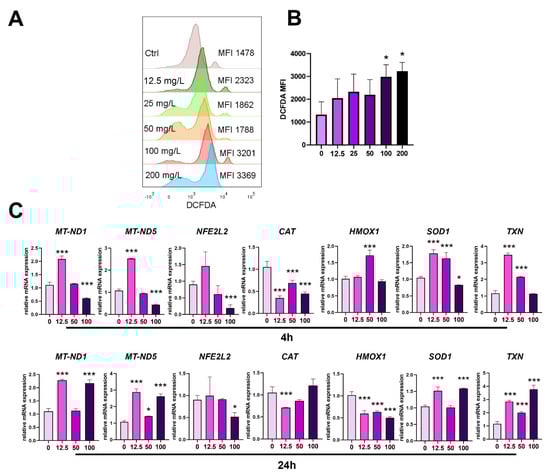 Autophagy and apoptosis are tightly regulated by oxidative stress. The proapoptotic concentrations of PoPEx (100 µg/mL and 200 µg/mL) induced oxidative stress in PBMC culture after 24 has detected by increased DCFDA fluorescence (Figure 4A,B). This was in accordance with the downregulation of mRNA expression for key regulators of oxidative status in the cells, mitochondrial (MT)-NADH (MT-ND1), MT-ND5, Nuclear factor-erythroid factor 2-related factor 2 (Nrf2), coded by NFE2L2 gene, SOD-1, and CAT after 4 h in the presence of 100 µg/mL of PoPEx. No significant changes were observed in the mRNA expression for Heme-oxygenase 1 (HMOX1) and thioredoxin (TXN) using this proapoptotic concentration of PoPEx. The expression of several genes (MT-ND1, MT-ND5, HMOX1, SOD1, and TXN) was upregulated in the presence of non-apoptotic concentrations of PoPEx (50 and/or 12.5 µg/mL), whereas CAT was still downregulated. After 24 h, with the exception of the downregulation of NFE2L2 and HMOX1, in the presence of the highest PoPEx concentration (100 µg/mL), the mRNA expression of most genes was upregulated. Lower concentrations downregulated the expression of CAT and HMOX1, whereas most other genes were upregulated (Figure 4C).
