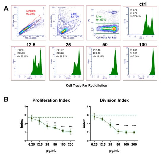 The effects of PoPEx on PHA-stimulated proliferation of PBMC. PBMC (3 × 105/well) pre-labeled with CellTrace Far-Red were cultured with PoPEx (6.25–200 µg/mL) or without PoPEx (ctrl) in the presence of PHA (10 µg/mL) for 4 days, followed by the analysis of Far-Red dilution by flow cytometry. (A) A representative gating strategy (the exclusion of doublets, cell debris, and dead (PI+ cells) is shown, and the analysis of Far-Red dilution is shown on histograms (PI-proliferation index, DI-division index, or div-percentage of division) from one experiment, out of 5 with similar results. (B) The summarized data for proliferation index and division index is shown as mean ± SD from 5 independent experiments * p < 0.05, ** p < 0.01, *** p < 0.005, compared to control non-treated PHA-PBMC (Friedman test; Dunn’s multiple comparison post-test).