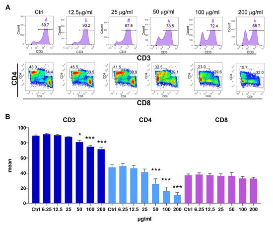 To see whether the inhibition of proliferation affects equally CD4 and CD8 T-cell subsets, a flow-cytometry analysis was performed. As shown in Figure 6A,B, the frequencies of total T-cells (CD3+) and CD4+ T-cells were reduced at concentrations of 50 µg/mL of PoPEx and higher, whereas the total frequency of CD8+ T-cells was not significantly affected (p > 0.05), even though a slight downregulation of CD8+ T-cells was observed. The decrease of CD4+ T-cells was significantly higher than that of CD3+ T-cells, which indicated that a significant proportion of viable CD4+ T-cells lost membranous CD4 expression.