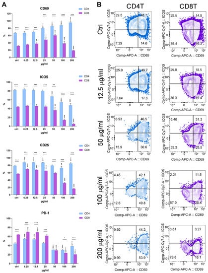 We analyzed the effect of different concentrations of PoPEx on three activation molecules (CD69, CD25, and ICOS) and PD1 (an inhibitory molecule upregulated upon activation) on CD4+ and CD8+ T-cell subsets in PHA-stimulated PBMC. The results presented in Figure 7 showed a different pattern of expression. CD69, CD25, and ICOS had a higher expression on control CD4+ T-cells compared to CD8+ T-cells, whereas the opposite was noticed for PD1. PoPEx at the concentrations of 25 µg/mL to 200 µg/mL upregulated the expression of CD69 in a dose-dependent manner. The upregulation of CD69 on CD8+ T-cells was seen at the concentration of 12.5–50 µg/mL of PoPEx, followed by its downregulation which was statistically significant at the highest dose (200 µg/mL). Except for the concentration of 50 µg/mL, the expression of CD69 was much higher on CD4+ T-cells, as compared to CD8+ T-cells.