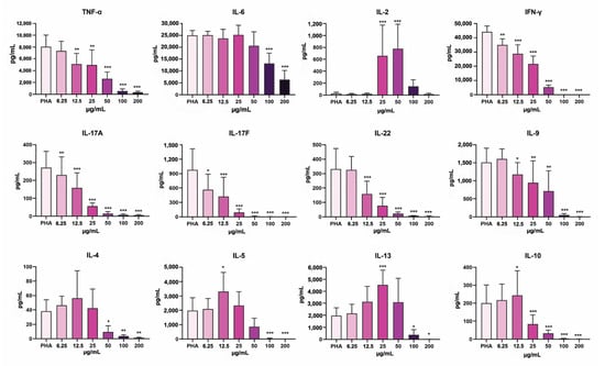 Twelve cytokines associated with the function of T-cell subsets were analyzed in PHA-stimulated PBMC cultures in different concentrations of PoPEx (Figure 8). The level of TNF-α was significantly decreased at the concentrations of PoPEx from 12.5–200 µg/mL, dose-dependently, whereas IL-6 was downregulated only at higher concentrations (100 µg/mL and 200 µg/mL). Both T helper (Th)1 cytokine (Interferon-γ) (IFN-γ) and Th17 (IL-17A and IL-17F) cytokines were significantly downregulated at all concentrations applied, dose-dependently. Similarly, the production of IL-22 (a Th17/Th22 cytokine) and IL-9 (a Th9 cytokine) was significantly decreased from 12.5–200 µg/mL and 25–200 µg/mL, respectively. The dynamics of Th2 cytokines were different. Whereas the level of all three cytokines (IL-4, IL-5, and IL-13) was decreased at concentrations of 50–200 µg/mL (IL-4 and IL-5) or 100 µg/mL and 200 µg/mL (IL-13), the levels of IL-5 and IL-13 were increased at lower concentrations of PoPEx (12.5 µg/mL or 25 µg/mL, respectively). The level of IL-10, a key Treg cytokine, was increased at lower concentrations of PoPEx (12.5 µg/mL) and significantly decreased at 50–200 µg/mL of PoPEx. Of all these cytokines, the level of IL-2 was upregulated at 25 µg/mL and 50 µg/mL. In all other cultures, including the control, its level was very low.