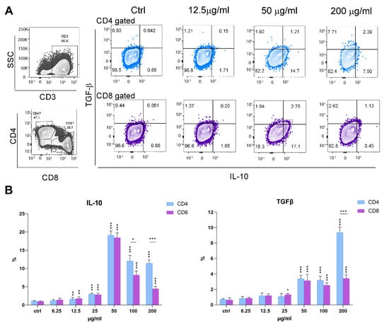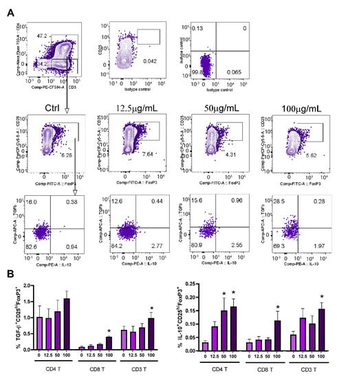 When the frequency of Tregs was analyzed within CD4+ T-cells (CD4+CD25hiFoxp3+) (Figure 10A,B), its proportion was higher in the presence of a lower concentration of PoPEx (12.5 µg/mL). Although the proportions of IL-10+ Tregs and TGF-β+ Tregs were very low, both in control and PoPEx-treated cultures, there was a statistically significant relative increase of IL-10+ Tregs at higher concentrations of PoPEx in total T-cells (CD3+) and both CD4+ and CD8+ T-cell subsets. The frequency was higher in the CD4+ T-cell subset. The proportion of TGF-β+ Tregs in control cultures was higher than IL-10+ Tregs, but a similar pattern of TGF-β+ Tregs frequency was seen in the presence of PoPEx.
