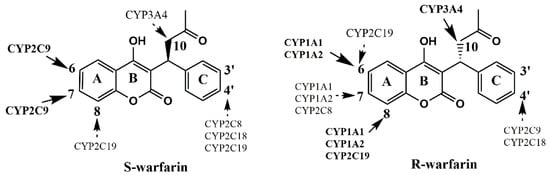 Warfarin, the most commonly prescribed oral anticoagulant, is indicated for the treatment and prevention of atrial fibrillation, venous thromboembolism and other coagulopathies [1]. Warfarin is clinically administered as a mixture of the S- and R-stereoisomers [2]. S-Warfarin is a 3–5 times more potent inhibitor of the vitamin K epoxide reductase complex than R-warfarin [3]. Despite its extensive use, warfarin therapy is complicated by wide inter-individual variabilities in responses and numerous drug–drug interactions (DDIs) [4,5]. These unpredictable abilities are largely due to drug metabolism [6], as warfarin undergoes extensive hepatic metabolism into less active or inactive metabolites [7]. Warfarin is metabolized via multiple cytochrome P450 (CYP) enzymes into a series of hydroxylation metabolites by regio-selectively introducing a hydroxyl group at the different positions on the molecule (Figure 1). S-Warfarin is primarily (>80%) metabolized by CYP2C9 [2] forming S-7-hydroxy warfarin (OH-warfarin), the major metabolite observed in human plasma, and S-6-OH-warfarin [7,8]. Minor pathways involve CYP2C8, 2C18, 2C19, and CYP3A4 to form S-4′-, 8-, and 10(R;S)-OH-warfarin [9,10]. Whereas, R-warfarin is approximately 60% oxidized by CYP1A2 and 3A4, preferentially forming 10(R;S)-OH-warfarin via CYP3A4 [7]. Several other CYP enzymes, including CYP1A1, 2C18, 2C8, 2C19, and 2C9, also demonstrate minor R-4′-, 7-, 6-, and 8-hydroxylation activities [7,9,11,12,13].