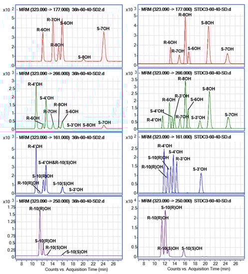 Considering the polarity and acid-base properties of warfarin and its hydroxylation metabolites, acetonitrile with 0.1% FA was used as the organic mobile phase. Several elution gradients were tested to archive the baseline separation for all hydroxywarfarin analytes. The preliminary results showed that the separation was improved by increasing the water phase ratio, resulting in a longer analysis time. Under an overall consideration of sensitivity and analysis time, the mobile phase was determined with 60% phase A (0.1% FA in water) and 40% phase B (0.1% FA in acetonitrile) at a flow rate of 0.40 mL/min for 50 min. The commercially available 3′-, 4′-, 6-, (S/R)-7-, 8-, and (S/R)-10-OH-warfarin were added as reference compounds to evaluate the validity of this approach. A total of six warfarin hydroxylated metabolites, comprising seven pairs of enantiomers, could be identified, including A-rings hydroxywarfarins (S/R-6-OH-warfarin, S/R-7-OH-warfarin, and S/R-8-OH-warfarin), C-rings hydroxywarfarins (S/R-3′-OH-warfarin and S/R-4′-OH-warfarin), and 10-hydroxywarfarins (S/R-10(R)-OH-warfarin and S/R-10(S)-OH-warfarin) (Figure 3). To our knowledge, simultaneous baseline separation of all hydroxywarfarin enantiomers has not been reported previously, although multiple groups resolved part of the warfarin and hydroxylation metabolites enantiomers [6,9,19,20]. Moreover, the testing process of elution program gave us inspiration that, theoretically, this method could be adapted to determine any target composition of warfarin and/or hydroxywarfarins enantiomers, as long as a suitable elution program and analysis time were set.