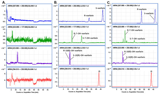 The following supporting information can be downloaded at: https://www.mdpi.com/article/10.3390/pharmaceutics14061141/s1, Table S1: Overview of previously published bioanalytical methods that quantify enantiomeric warfarin and hydroxywarfarins [6,9,17,19,20,27,28,29,40,41,42,43]; Table S2: The targeted MRM channels for hydroxywarfarins; Table S3: The calibration curves, linearity range, and LLOQs of the assay (n = 6).