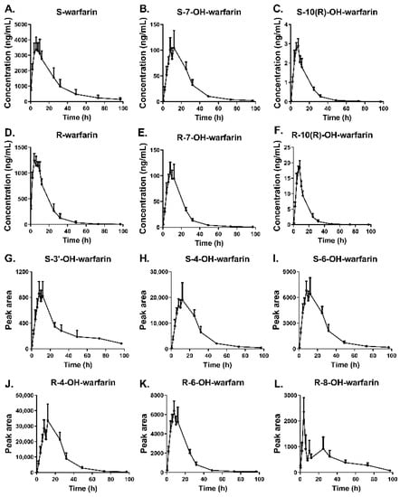 Mean plasma concentration/peak area–time curves of warfarin and its hydroxylation metabolites in SD rats after oral administration of warfarin 2 mg/kg (n = 8). Quantification of S/R-warfarin (A,D), S/R-7-OH-warfarin (B,E) and S/R-10(R)-OH-warfarin (C,F); and relative quantification of S-3′-OH-warfarin (G), S/R-4′-OH-warfarin (H,J), S/R-6-OH-warfarin (I,K), and R-8-OH-warfarin (L).
