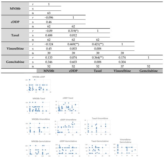 A correlation analysis of the responsiveness of these tumors to the different treatments was then performed (Figure 1). Pearson’s correlation indicated significant cross-resistance among cisplatin, taxol, vinorelbine, and gemcitabine. By contrast, MN58b showed no significant cross-resistance to any of the chemotherapeutic drugs tested, consistent with its different mechanism of action [,].