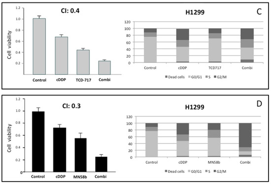The results shown above suggest the putative effectiveness of combined therapy between cisplatin and ChoKα inhibitors. In order to address this issue, the cytotoxic effects of combinations of cisplatin and the ChoKα inhibitors MN58b or RSM-932A/TCD-717 were determined in the human NSCLC H460 cell line (Figure 2A,B). To this end, cell viability was determined after treatment with different drug concentrations and schedules. Strong synergism (combination index, CI ≤ 0.4) was observed when the cells were treated following a sequential treatment initiated with cisplatin for a short period of time (5 h), followed by treatment with RSM-932A/TCD-717 (Figure 2A) or MN58b (Figure 2B) for longer times. Synergism was observed in the different timepoints analyzed, treating with ChoKα inhibitors from 24 to 72 h. A moderate synergistic effect was also found with both agents following a concomitant treatment (CI = 0.5–0.8) (data not shown). These results were confirmed using a second NSCLC cell line, H1299 (Figure 2C,D).